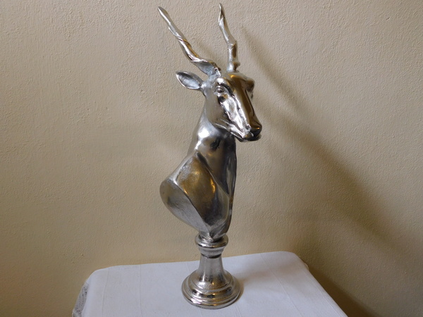 Designová kovová (aluminium) socha antilopa, ve stříbrné povrchové úpravě, výška 58 cm, váha 3,3 kg, dekorativní kus.
