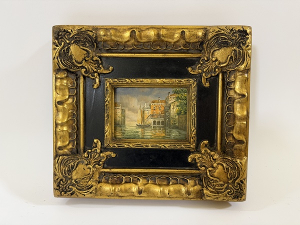 Obraz - Benátky - na dřevovláknité desce, ruční práce ve zdobeném zlatém rámu, vč.rámu 19 x 16,5 cm, bez rámu 7,5 x 5,5 cm, dekorativní obraz v interiéru.