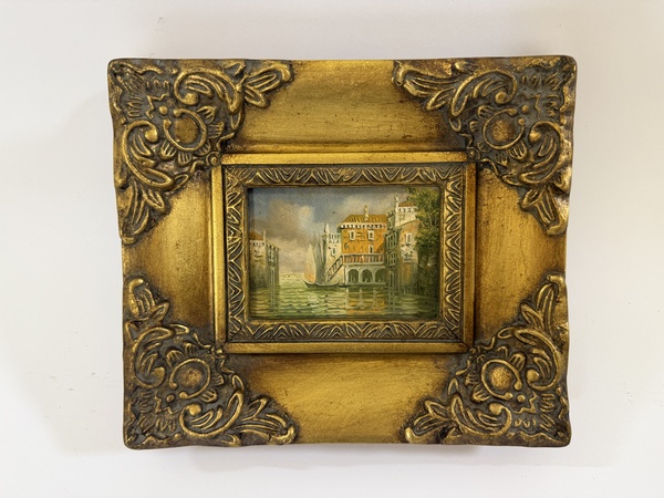Obraz - Benátky - na dřevovláknité desce, ruční práce ve zdobeném zlatém rámu, vč.rámu 19 x 16,5 cm, bez rámu 7,5 x 5,5 cm, dekorativní obraz v interiéru.