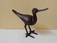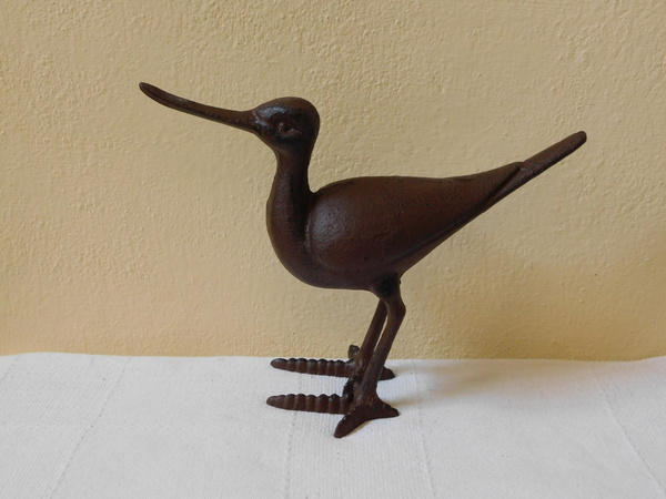 Brodivý pták z kovu (litina), výška 18,5 cm, šířka 9,5 cm, délka 25 cm, váha 1,10 kg.