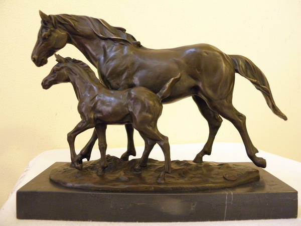 Krásná bronzová socha na mramorovém podstavci klisna s hříbětem, výška 24 cm, délka 32 cm, mramorový podstavec délka 30 cm, šířka 12 cm, tloušťka 3,3 cm, váha 6,5 kg, značeno, nádherný kus pro milovníky koní.