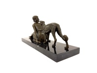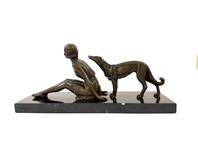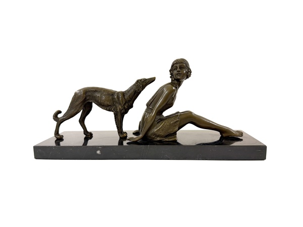Dívka s barzojem - bronzová socha na mramorovém podstavci, výška 13 cm, mramorový podstavec 29 x 9 x 2 cm, váha 2,35 kg, značeno.
