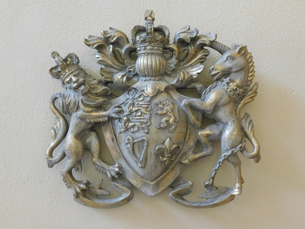 Nástěný erb z polyresinu se zlatou povrchovou úpravou, výška 36 cm, šířka 38 cm, hloubka 5,5 cm, váha 1,25 kg, háček k zavěšení.