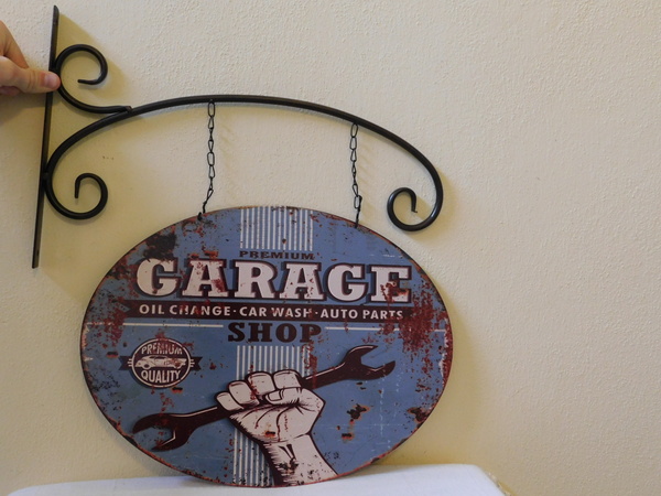 Garage - kovová reklamní cedule na kovové konzoli, cedule 40 x 30 cm, v konzoli 2 x otvor pro připevnění na stěnu, cedule má na každé straně jiný motiv.