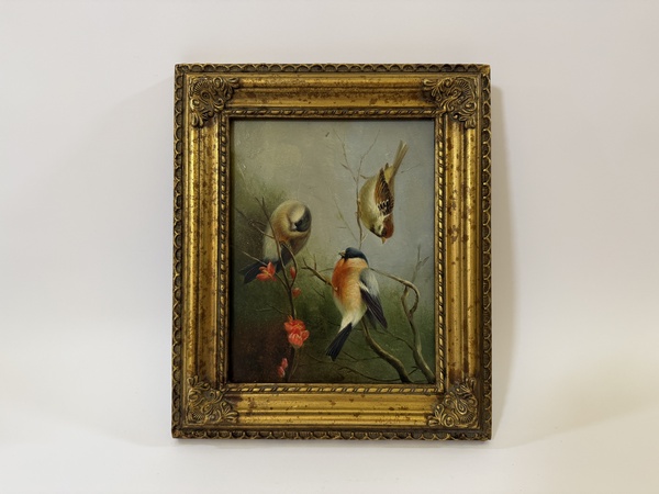 Obraz - hýl, sýkora, vrabec - na dřevovláknité desce, ruční práce ve zdobeném zlatém rámu, vč.rámu 34 x 29 cm, bez rámu 24,5 x 19 cm, dekorativní obraz v interiéru.