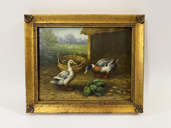 Obraz - kachny pár - na dřevovláknité desce, ruční práce ve zlatém dřevěném rámu, vč.rámu 30 x 25 cm, bez rámu 24 x 19 cm, dekorativní obraz v interiéru.
