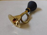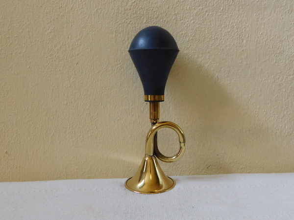 Klakson, funkční mosazný s gumovým balónkem, krásný pronikavý tón, délka 20 cm, balónek průměr 6 cm.