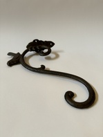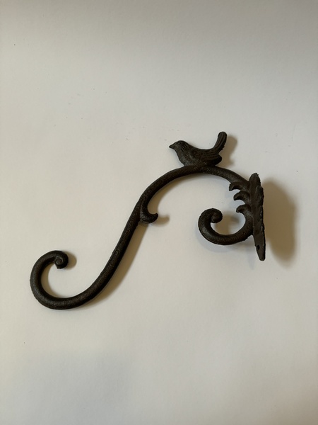 Litinová nástěnná konzole s ptáčkem, výška 20 cm, hloubka 24 cm, váha 0,46 kg, otvory k upevnění na stěnu.