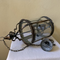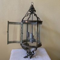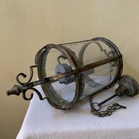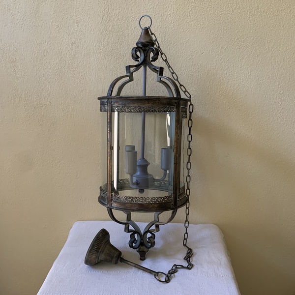Kovový zdobený lustr lucerna na řetězu se 3 kalíšky na svíčky nebo možno předělat na elektřinu, délka celkem 190 cm, lucerna výška s okem 71 cm, průměr 26 cm, otevíratelná dvířka, sklo a kov, váha celkem 3,5 kg, hezký kousek.