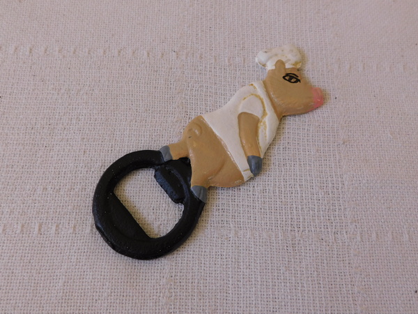 Litinový otvírák na lahve - prasátko kuchař v barevné úpravě, délka 12,5 cm, šířka 4,5 cm, váha 0,10 kg.