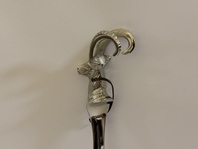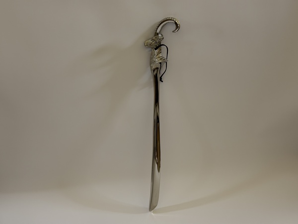 Krásná kovová nazouvací lžíce - hlava kozorožce, délka 53,5 cm, váha 0,35 kg, pevná.