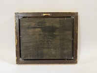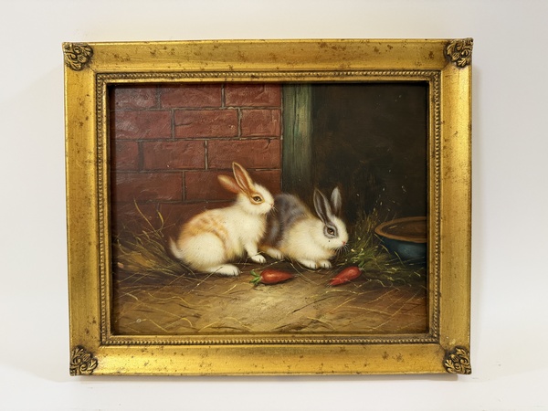 Obraz - králíčci s mrkví - na dřevovláknité desce, ruční práce ve zlatém dřevěném rámu, vč.rámu 30 x 25 cm, bez rámu 24 x 19 cm, dekorativní obraz v interiéru.