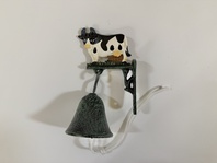 Zvon na ozdobné konzoli s kravičkou, vše z litiny, výška 17 cm, výška zvonu 6,5 cm, průměr zvonu 7 cm, váha celkem 0,45 kg.