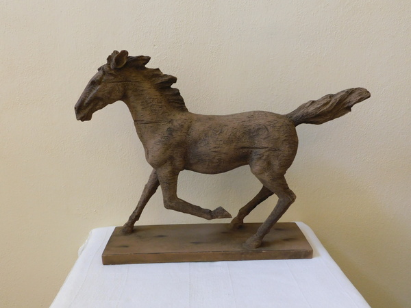 Socha běžícího koně z polyresinu, dojem starého dřeva, výška 40 cm, délka 56 cm, sokl 40 x 12 x 2,4 cm, váha 2,80 kg.