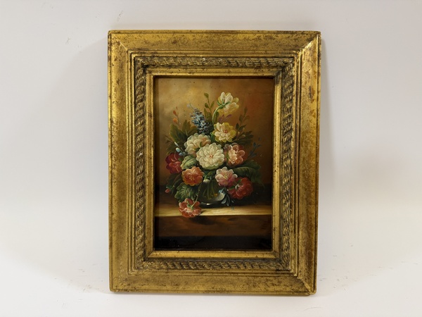 Obraz - květiny zátiší - na dřevovláknité desce, ruční práce ve zlatém dřevěném rámu, vč. rámu 26 x 21 cm, bez rámu 16,5 x 11,5 cm, dekorativní obraz v interiéru.