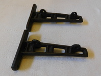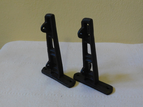 Kovové (litina) nástěnné párové konzole, tmavě hnědá barva, otvory na připevnění ke stěně, výška konzole 10 cm, šíře 4 cm, hloubka 15,5 cm, váha jednoho kusu 0,35 kg.