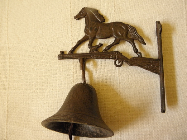 Zvon na ozdobné konzoli s koněm, vše z litiny, výška 21 cm, šířka konzole 3 cm, průměr zvonu 10 cm, výška zvonu 7 cm, váha celkem 1,4 kg, nádherný tón.