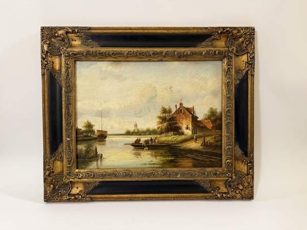 Obraz - loďka na řece - na dřevovláknité desce, ruční práce ve zdobeném zlatém rámu, vč. rámu 57 x 47 cm, bez rámu 39 x 29 cm, dekorativní obraz v interiéru.