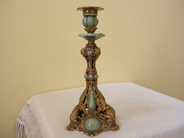 Krásný jednoplamenný mosazný svícen, kombinovaný s pukaným porcelánem, který dělá dojem polodrahokamu, výška 32 cm, váha 1,20 kg.