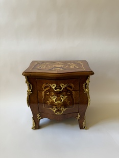 Mini komoda v barokním stylu, výška 32 cm, šířka 33 cm, hloubka 26 cm.