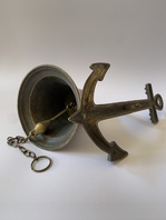 Krásný mosazný zvon - konzole ve tvaru kotvy, samotný zvon výška 11 cm, průměr 13,5 cm, na srdci řetízek ke zvonění, konzole výška 24 cm, váha celkem 1,30 kg.
