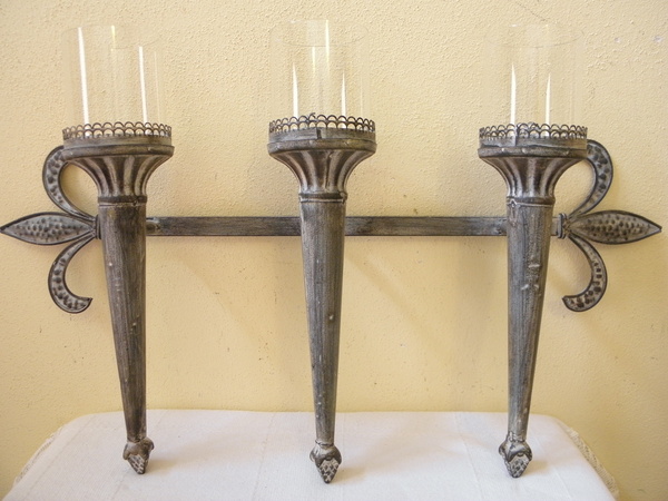 Nástěnné ozdobné kovové louče se skleněným širmem, výška 31 cm, otvory pro uchycení na zeď, délka konzole 65 cm, hloubka 13 cm, průměr skla 8 cm, výška 10 cm, průměr pro vložení svíčky 7 cm, krásné a funkční.