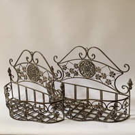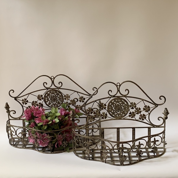 Kovové nástěnné ozdobné truhlíky na květiny nebo jako odkládací polička na vše možné, větší - výška 31 cm, délka 43,5 cm, šířka 17,5 cm, váha 1,45 kg, menší - výška 30,5 cm, délka 43 cm, šířka 17 cm, váha 1,35 kg, provedení vintage antik.