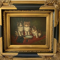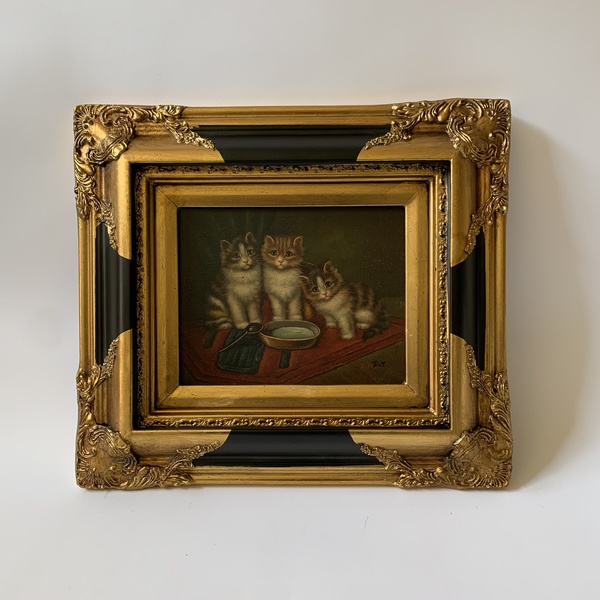 Obraz koťata - na kartonu ruční práce v nádherném bohatě zdobeném zlato černém rámu (kašírovaná masa, polyresin), signováno, vč.rámu 45 x 40 cm, bez rámu 24 x 19 cm, nádherný dekorativní obraz v interiéru.