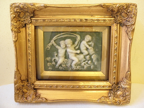 Krásný obrázek pod sklem, zlatý bohatě zdobený rám, 31 x 26 cm rozměr včetně rámu, výdusek (umělý kámen). Rozměr - výdusek - 16 x 11 cm.
