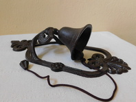 Litinový nástěnný parádní zvon, výška 37 cm, šířka 17 cm, hloubka 11 cm, váha celkem 1,35 kg, zvon výška 7 cm, průměr zvonu 9,5 cm, otvory k připevnění na stěnu.