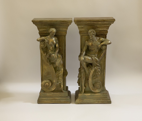 Párová dekorace v antickém stylu z polyresinu - muž a žena opřené o spirálovitý prvek, rozměr a váha jednoho kusu, výška 49 x 22,5 x 11,5 cm, váha 3,10 kg,