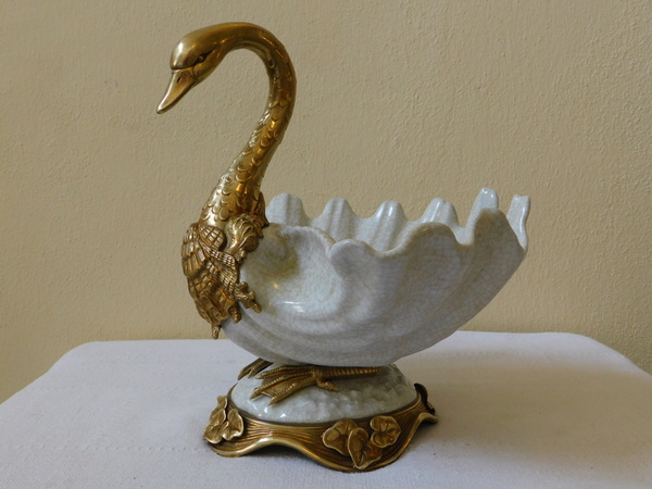 Porcelánová žardiniéra v mosazné figurální montáži,výška 25 cm, délka 22 cm, šířka 27 cm, váha 2,7 kg, značeno, top dekorace.