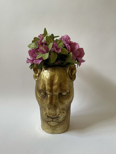 Puma - obal na květináč z polyresinu ve zlaté povrchové úpravě, výška 22 cm, šířka 14 cm, průměr pro květináč 10 cm a hloubka pro květináč 19 cm, váha 0,70 kg, květiny nejsou v ceně.