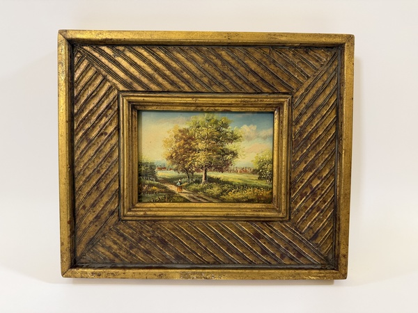 Obraz - romantická krajina - na dřevovláknité desce, ruční práce ve zdobeném zlatém rámu, vč.rámu 33 x 28 cm, bez rámu 16 x 11 cm, dekorativní obraz v interiéru.