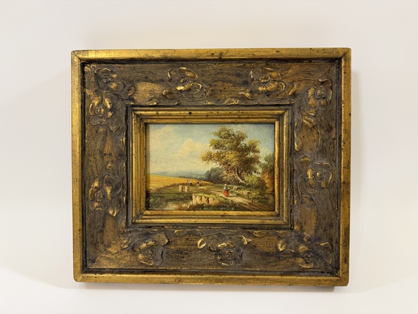 Obraz - romantická krajina - na dřevovláknité desce, ruční práce ve zdobeném zlatém rámu, vč.rámu 33 x 28 cm, bez rámu 16 x 11 cm, dekorativní obraz v interiéru.