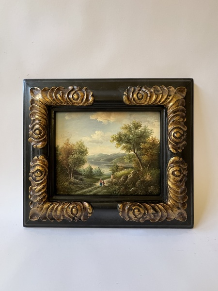 Obraz - romantická krajina - na dřevovláknité desce, ruční práce v bohatě zdobeném zlatém rámu (kašírovaná masa polyresin), vč.rámu 39 x 34 cm, bez rámu 23,5 x 19 cm, dekorativní obraz v interiéru.