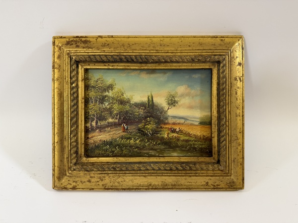 Obraz - romantická krajina s jezírkem - na dřevovláknité desce, ruční práce ve zdobeném zlatém rámu, vč.rámu 26 x 21 cm, bez rámu 16,5 x 11,5 cm, dekorativní obraz v interiéru.
