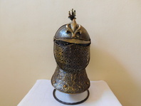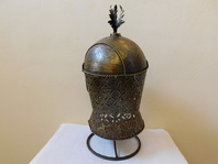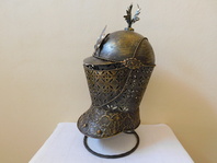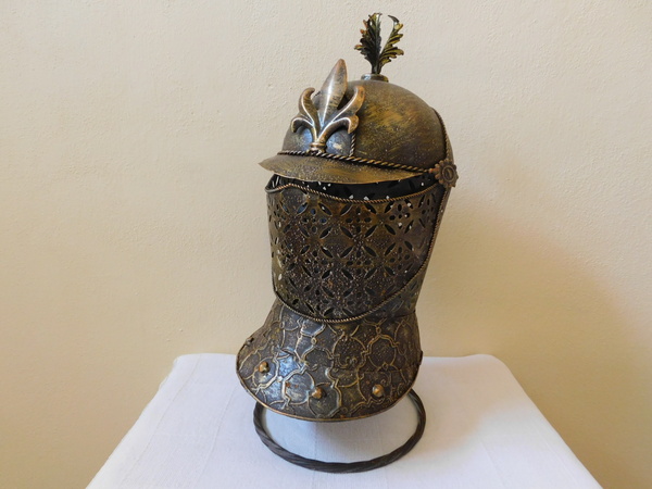 Rytířská kovová přilba na stojanu, výška 50 cm, průměr 24 cm, váha 1 kg, povrchová úprava antik.