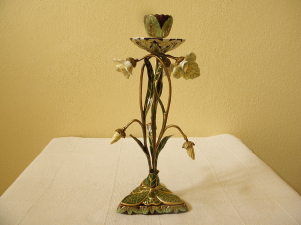 Krásný secesní jednoplamenný svícen, mosazné tělo znázorňující rostlinu, v kterém jsou usazeny porcelánové květy, průměr pro vložení svíce 3,2 cm, celková výška svícnu 28 cm, průměr koruny 11 cm, sokl 11 cm, váha 0,7 kg, krásný dekorativní kus.