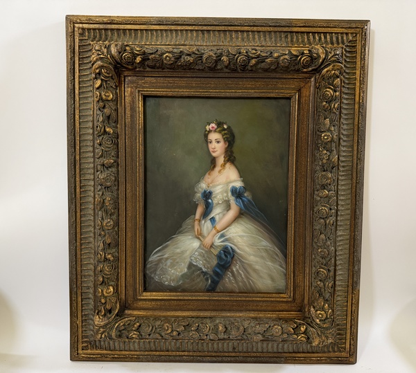 Obraz - Sisi Alžběta Bavorská - na dřevovláknité desce, ruční práce v bohatě zdobeném zlaceném rámu (kašírovaná masa polyresin), vč.rámu 71 x 60 cm, bez rámu 39,5 x 29,5 cm, dekorativní obraz v interiéru.