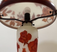 Skleněná lampa ve stylu Galle - červená růže. výška 55 cm, průměr 32 cm, průměr soklu 17 cm, délka kabelu 200 cm, váha 3 kg, žárovky 2 x 40 W.
