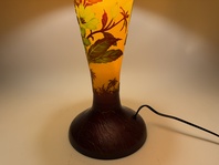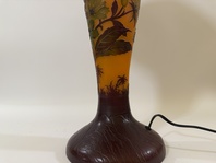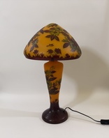 Skleněná lampa ve stylu Galle - oranžová, květy. výška 62 cm, průměr 33 cm, průměr soklu 18 cm, délka kabelu 200 cm, váha 3,50 kg, žárovky 2 x 40 W.
