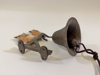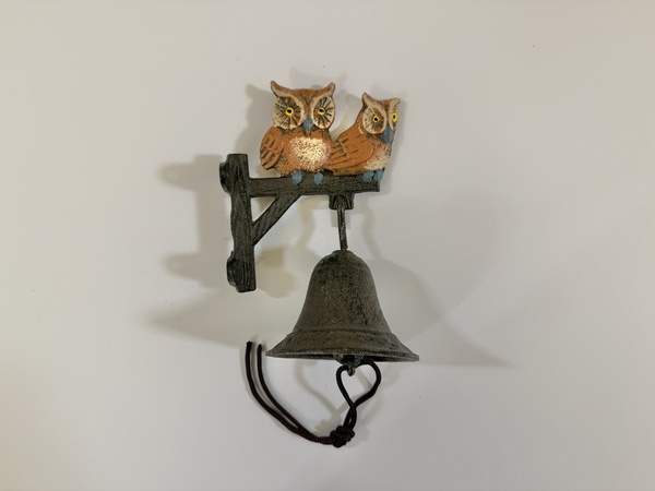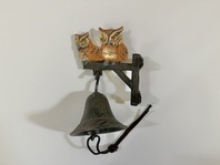 Zvon na ozdobné konzoli - sovy, vše z litiny, výška 20 cm, šířka 12 cm, výška zvonu 7 cm, průměr zvonu 9,5 cm, váha celkem 0,70 kg.