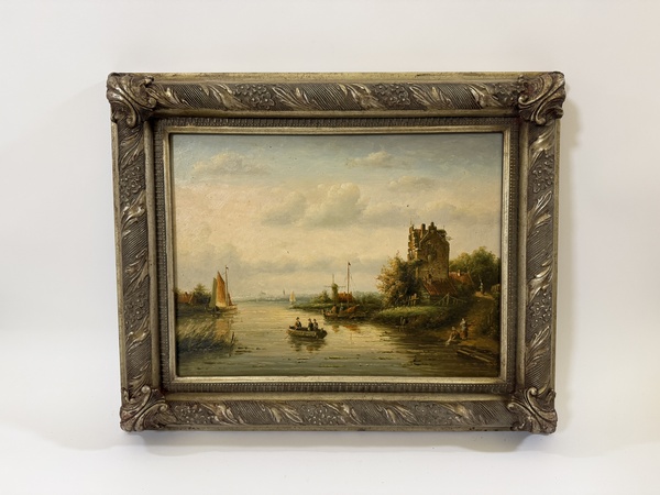 Obraz - starý mlýn u řeky - na dřevovláknité desce, ruční práce ve zdobeném zlatém rámu, vč. rámu 54 x 44 cm, bez rámu 39,5 x 29 cm, dekorativní obraz v interiéru.