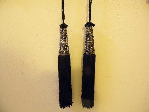 Dva kusy černých střapců na závěsy (nebo i na záclony), celková délka 30 cm, samotný střapec 21 cm, průměr střapce 2,5 cm, velmi dekorativní.