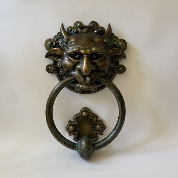 Velké kovové litinové klepadlo, povrchová úprava barvou - zlato bronzový odstín antiko, délka celkem 60 cm, šířka 39 cm, hloubka 15 cm, váha celkem 16 kg,