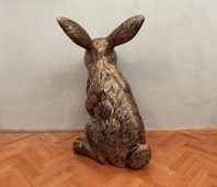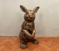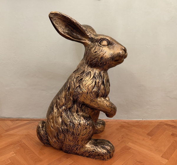 Socha zajíce z polyresinu ve zlatém barevném provedení, výška 115 cm, sokl 70 x 60 cm, pro svou velikost je vhodný osobni odběr, nebo jiná dohoda, váha do 10 kg.