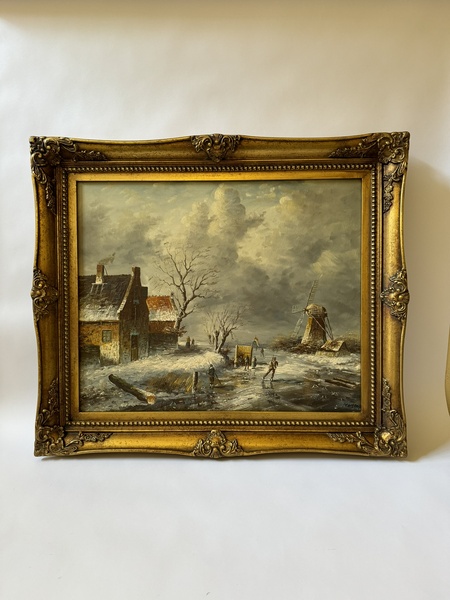 Obraz - zimní krajina - na plátně, ruční práce v bohatě zdobeném zlatém rámu (kašírovaná masa polyresin), vč.rámu 71 x 61 cm, bez rámu 55 x 45 cm, dekorativní obraz v interiéru.