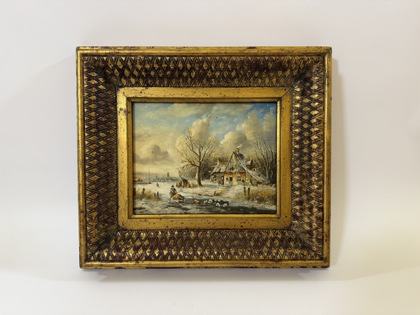 Obraz - zamrzlé jezero - na dřevovláknité desce, ruční práce ve zdobeném zlatém rámu, vč.rámu 42 x 36 cm, bez rámu 24 x 18,5 cm, dekorativní obraz v interiéru.