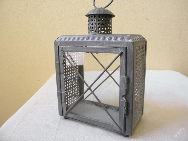 Luxusní lucerna materiál kov + sklo, výška 21 cm, šířka 14,5 cm, hloubka 8 cm, váha 0,5 kg, vrchní část boky jsou zdobené, přední dvířka otevíratelná s pojistkou pro vložení svíčky, na bocích lucerny dekorativní reliéfy, spodní sokl na nožkách.